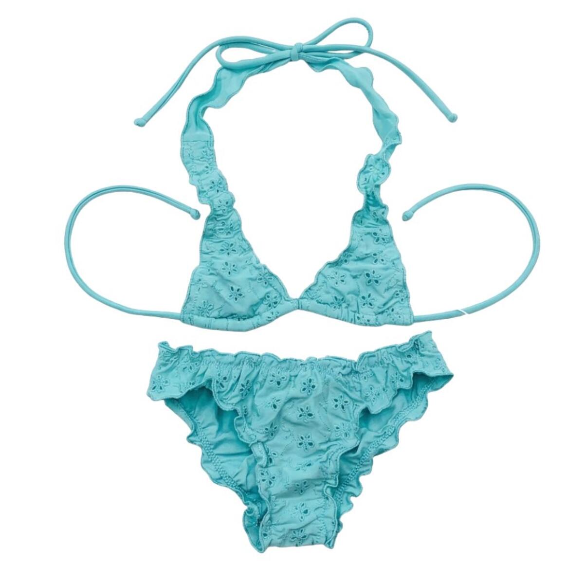 Girls' Sangallo-effect bikini consisting of a triangle top with adjustable ties and gathered bottoms.
