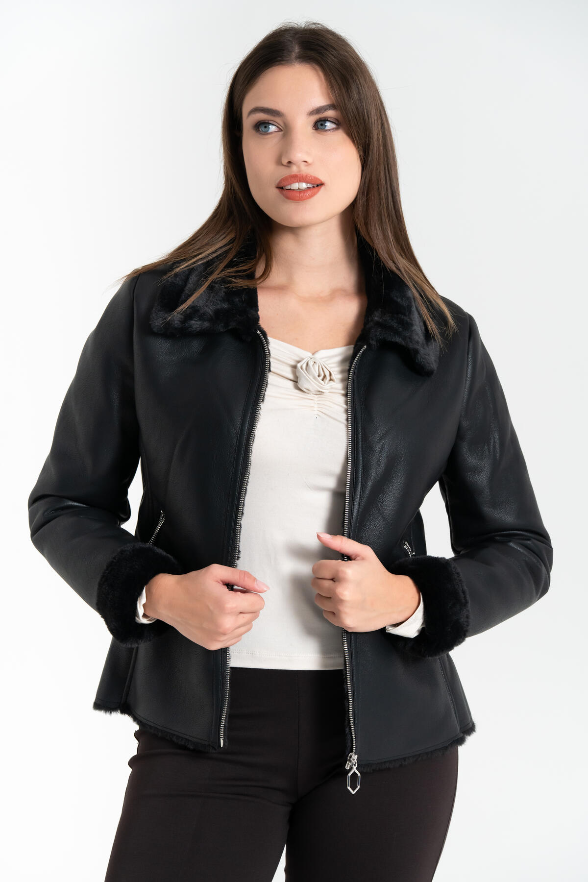 Women's faux leather zip-up jacket with a leather-look exterior and fur lining. Fur collar and front zip pockets.