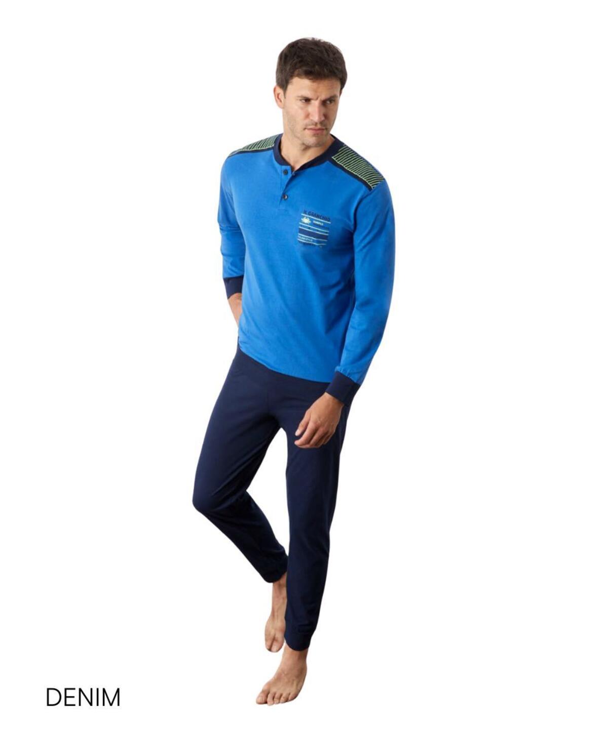 Men's henley pyjamas in cotton jersey with bands, logo and plain trousers with cuffs.