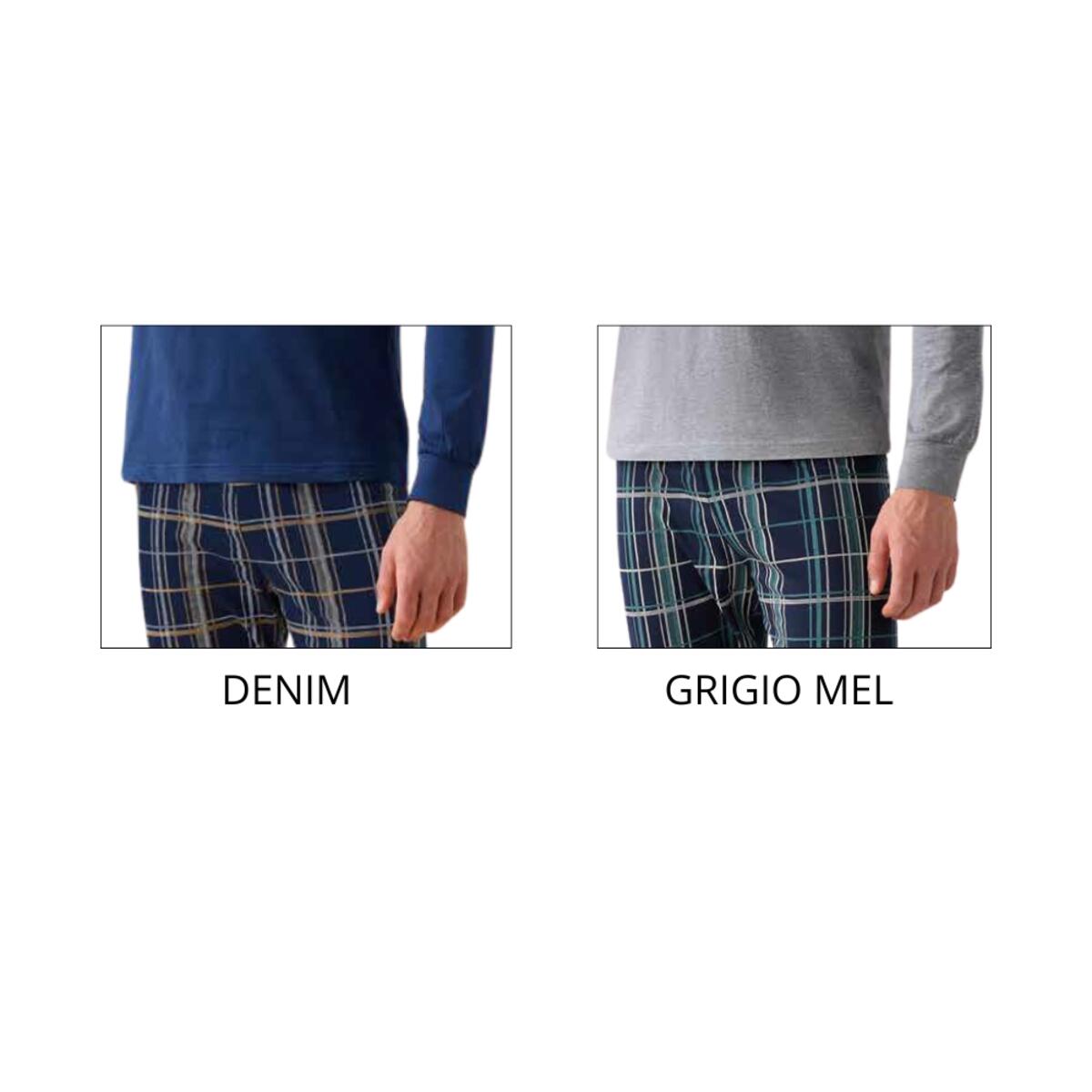 Men's henley pajamas in cotton jersey with a solid-colored top and tartan trousers with cuffs.
