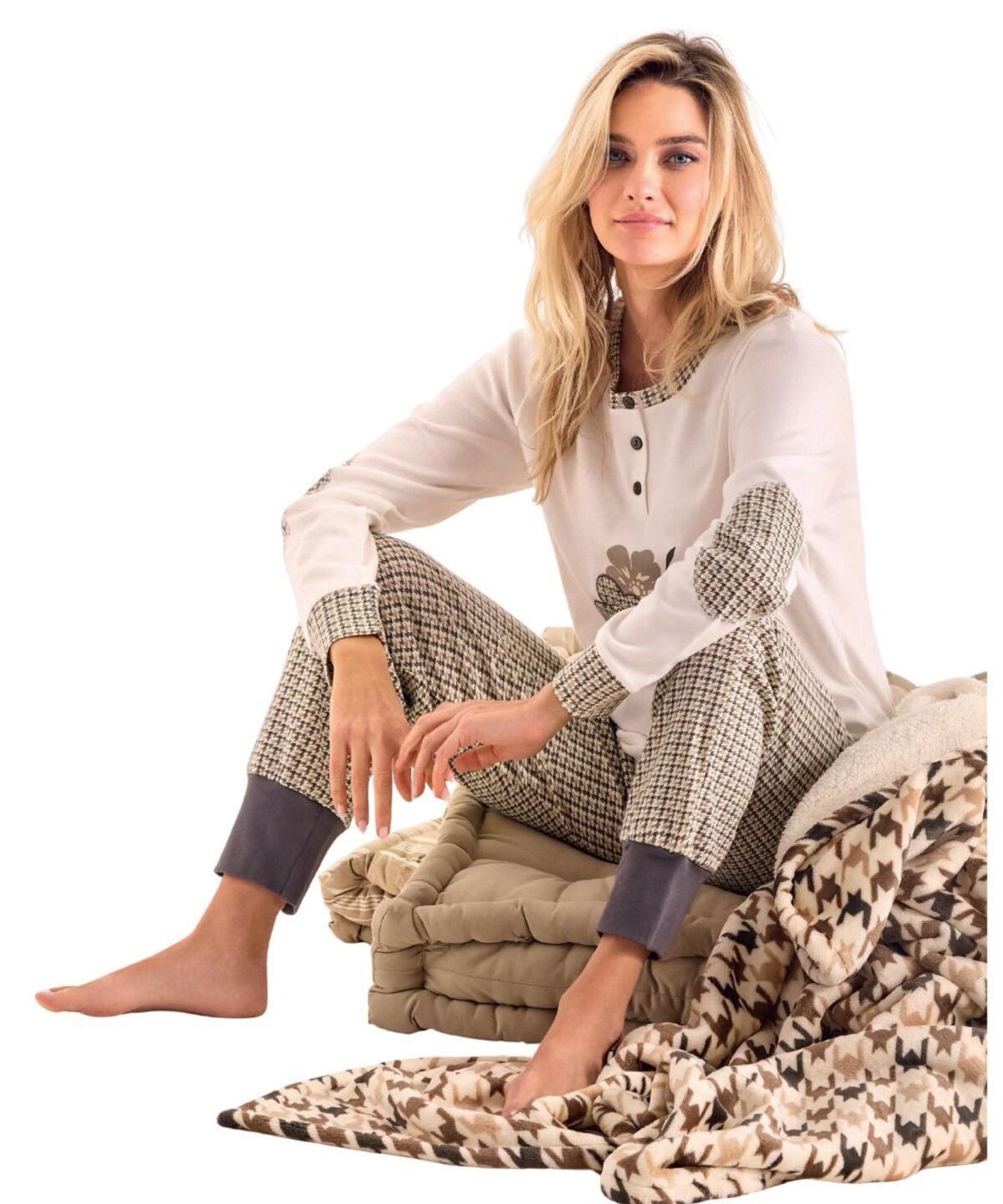 Pigiama donna a serafino in jersey di cotone caldo (medio peso) con stampa e pantalone fantasia con polsini.