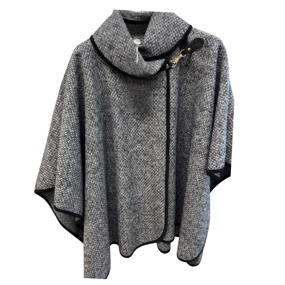 Mantella da donna realizzata in tessuto caldo rifinita con profili in contrasto, collo ampio e avvolgente arricchito dalla chiusura laterale con cinturino in ecopelle e gancio dorato.