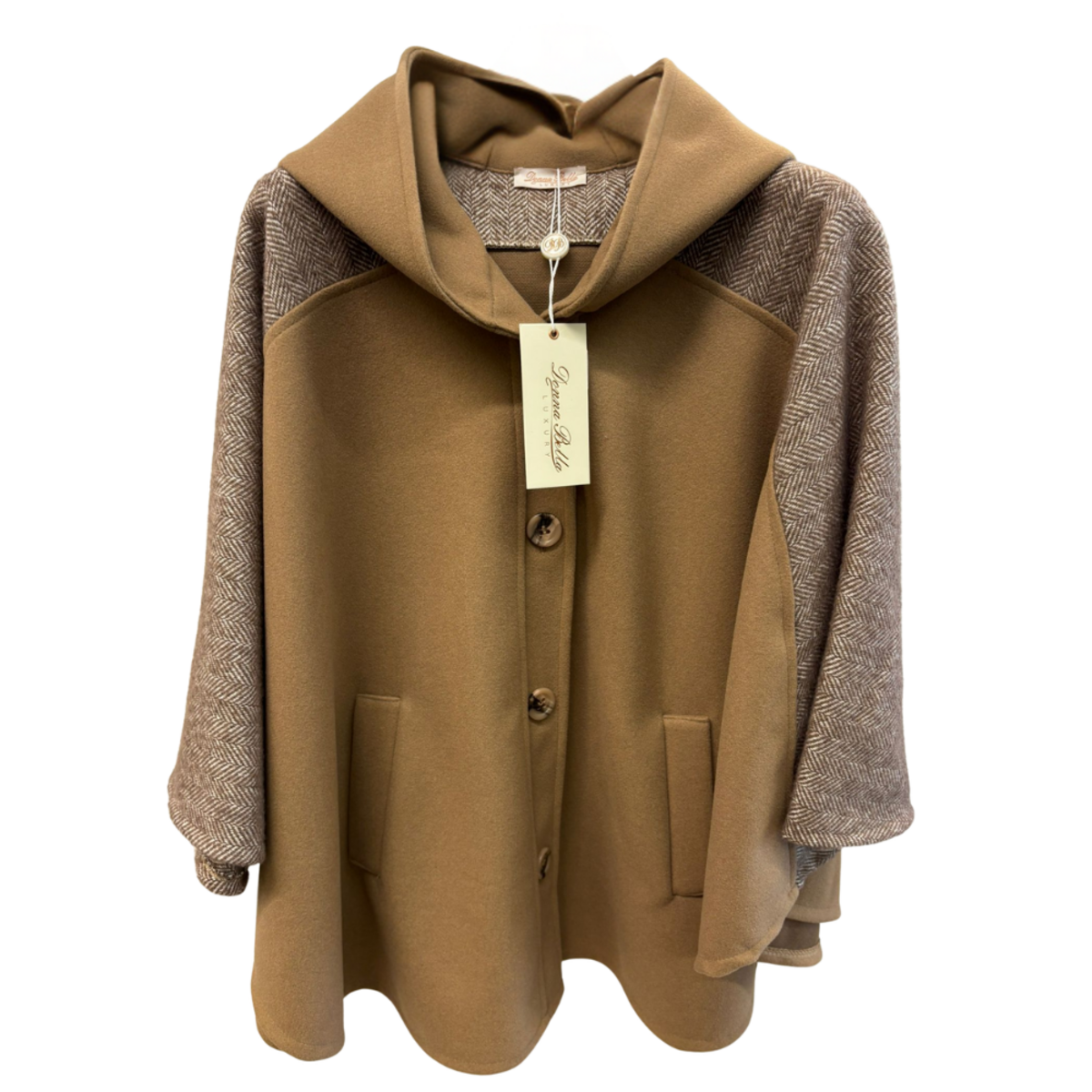 Mantella da donna con maniche in tessuto fantasia, design completato da un ampio cappuccio, chiusura con bottoni frontali tono su tono e pratiche tasche laterali.
