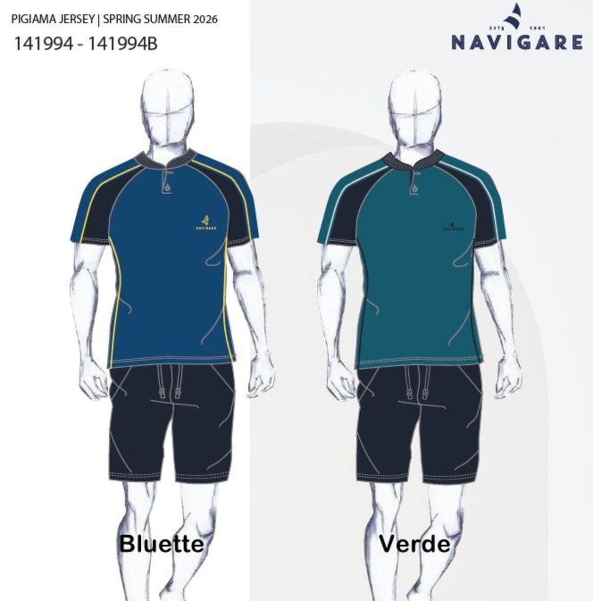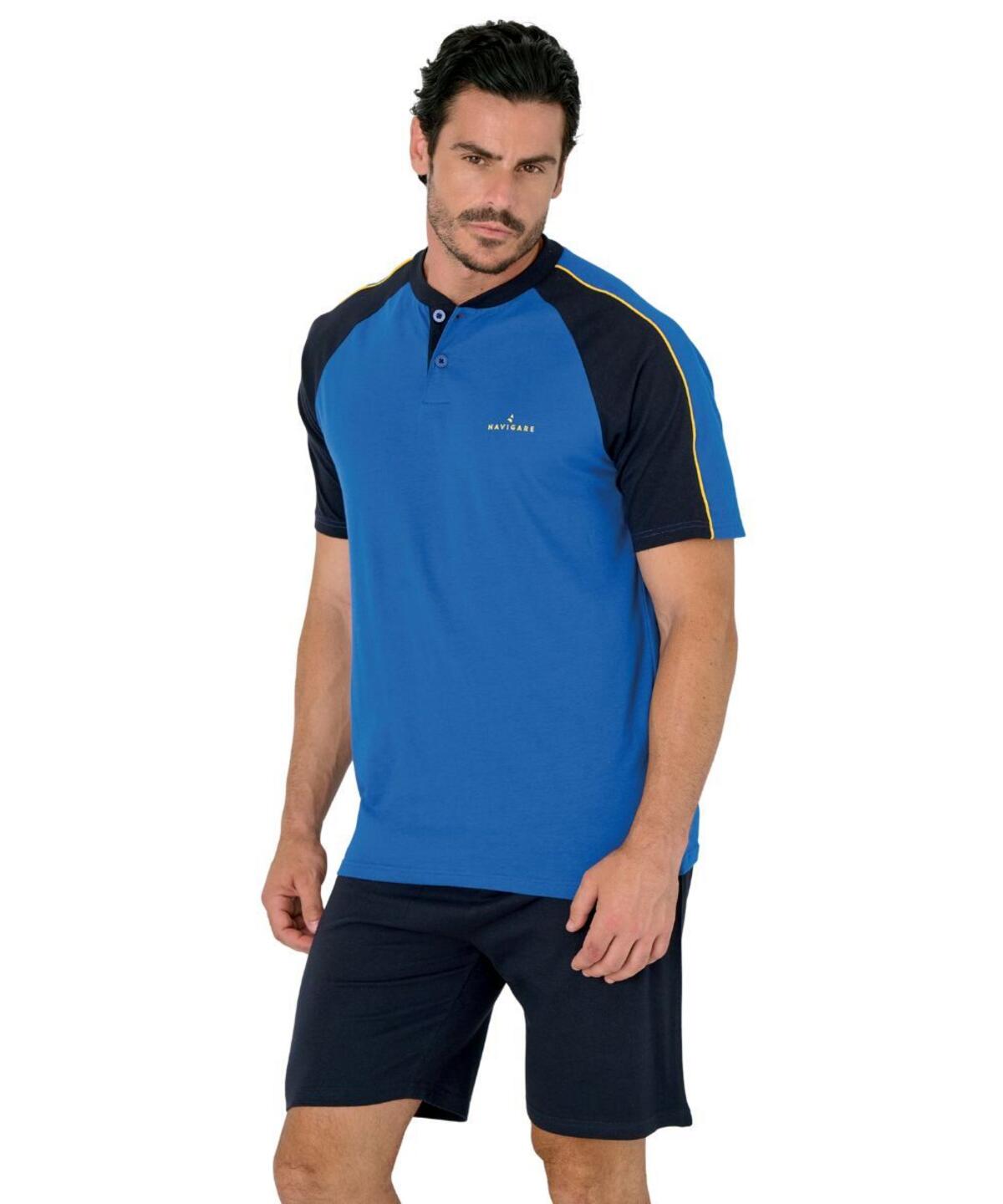 Pigiama uomo a serafino in jersey di cotone con bande e pantalone corto tinta unita.