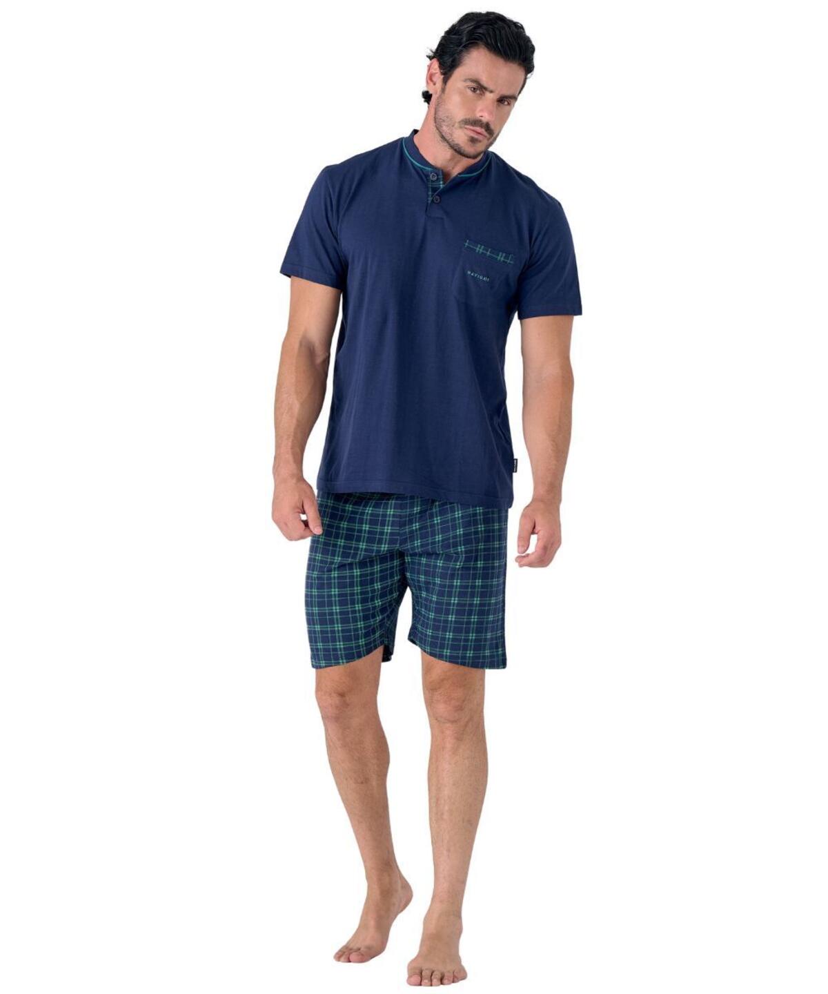 Pigiama uomo a serafino in jersey di cotone con stampa logo, taschino e pantalone corto scozzese.