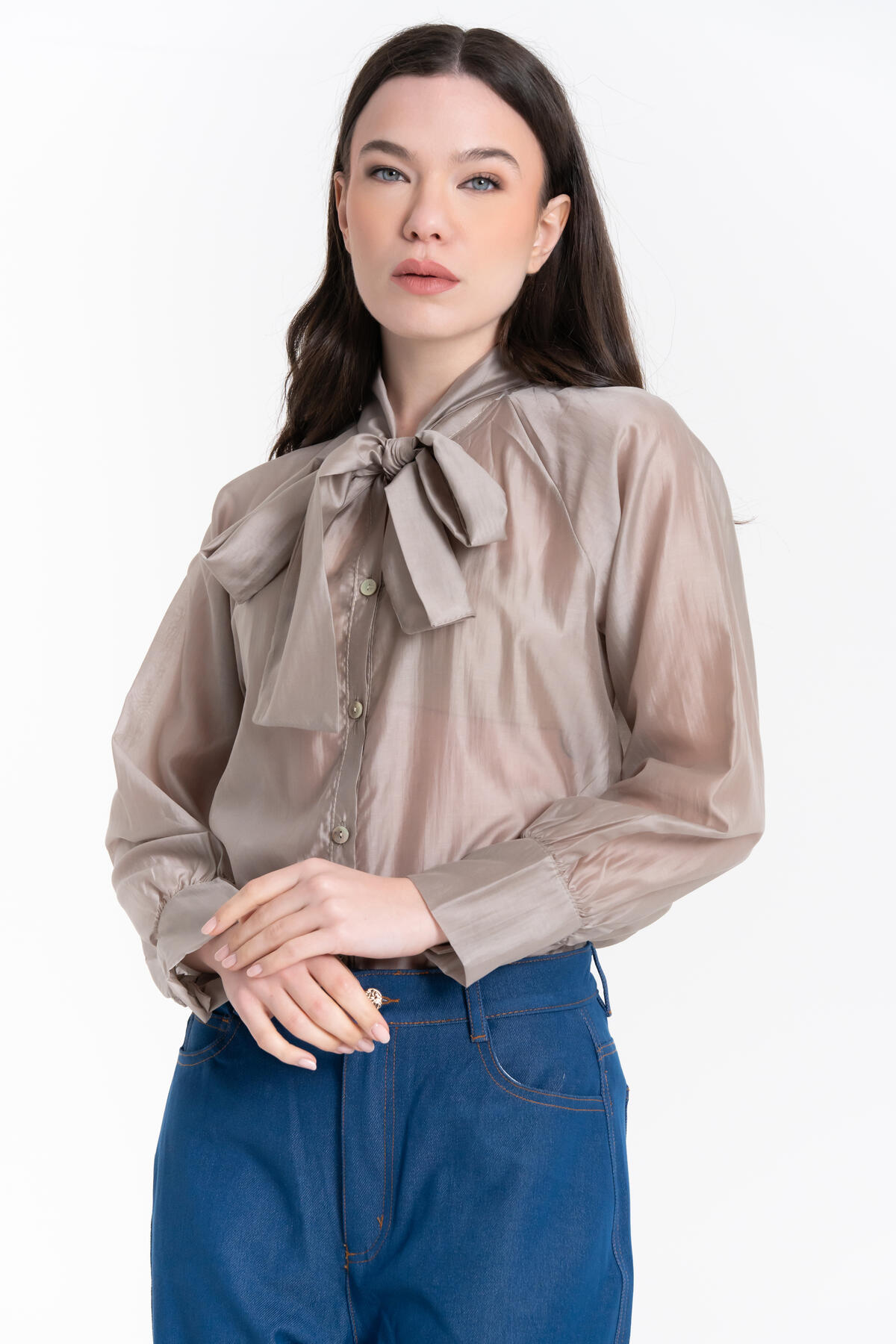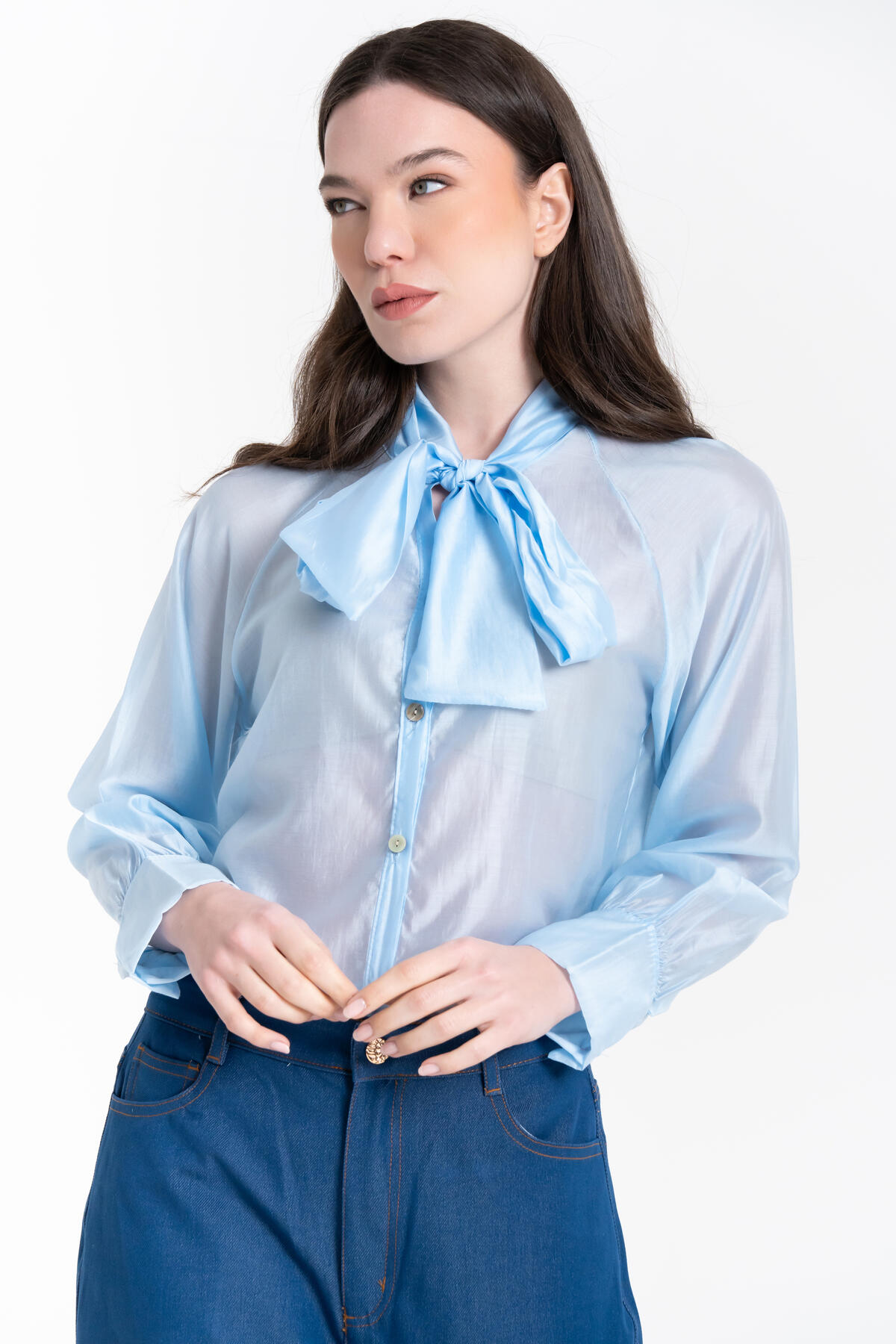 Camicia in Tencel dal tessuto leggero e fluido. Collo con fiocco, abbottonatura frontale e polsini con bottone.