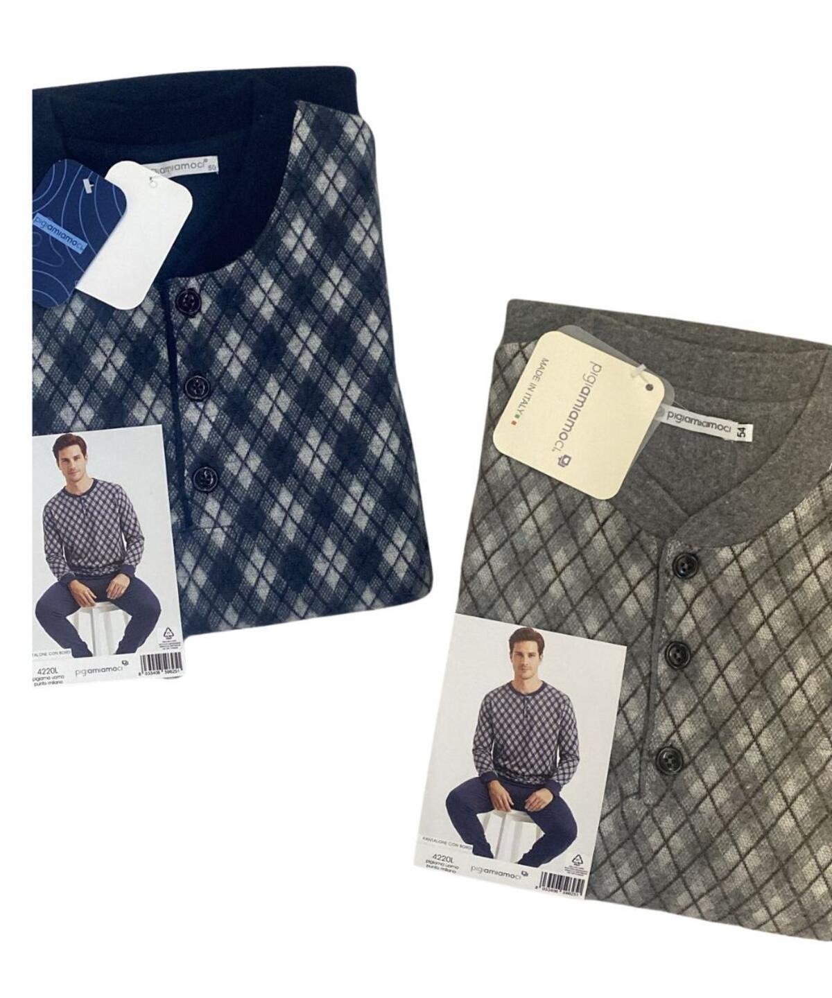 Pigiama uomo a serafino in caldo jersey di cotone lanato (punto Milano) con motivo a rombi e pantalone con polsini.