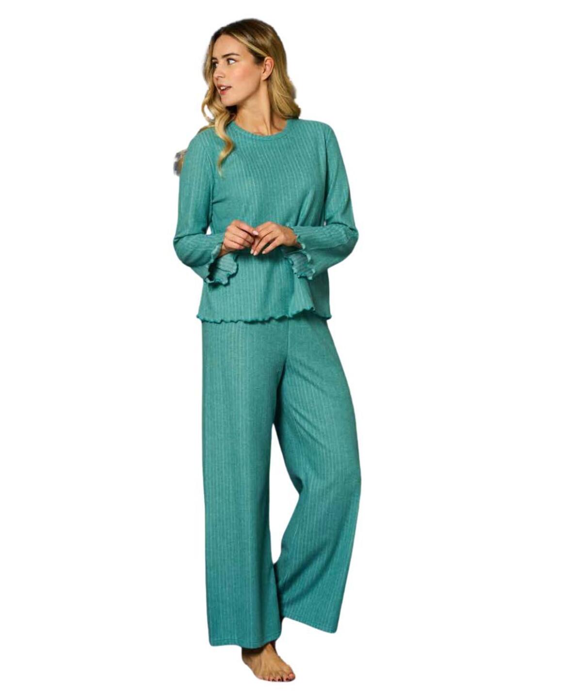 Pigiama donna girocollo in CALDO jersey di cotone lanato a coste ( punto Milano) e pantalone a palazzo.