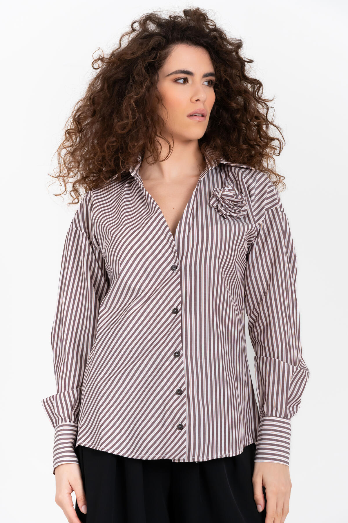 Camicia da donna realizzata in tessuto leggero con fantasia a righe verticali. Presenta colletto classico, chiusura frontale con bottoni e maniche lunghe con polsini alti. Il dettaglio floreale applicato sul petto aggiunge un tocco raffinato.