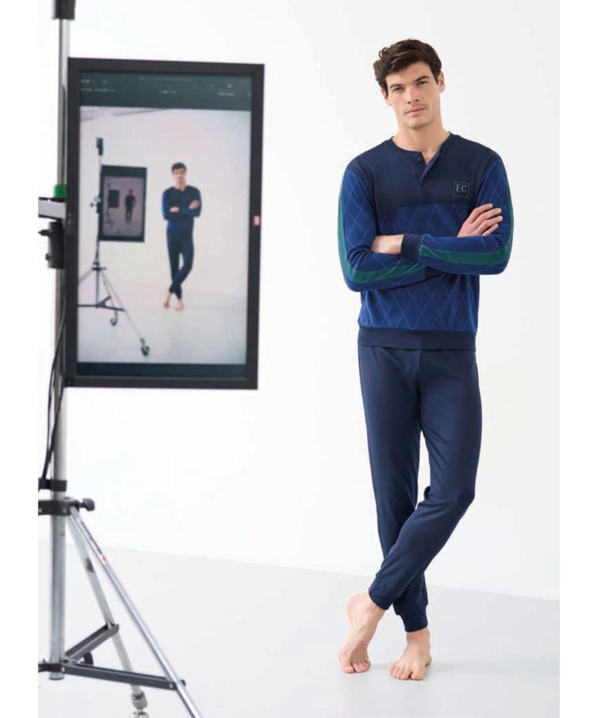 Pigiama uomo a serafino in jersey di cotone caldo (medio peso) con bande colorate e pantalone con polsini.