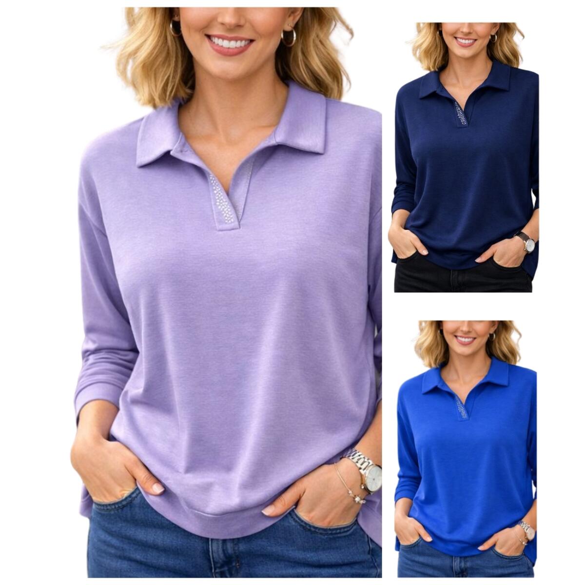Polo donna a manica lunga con decorazione strass, disponibile nelle taglia over 3XL e 4XL e nei colori Lilla, Navy e Bluette.