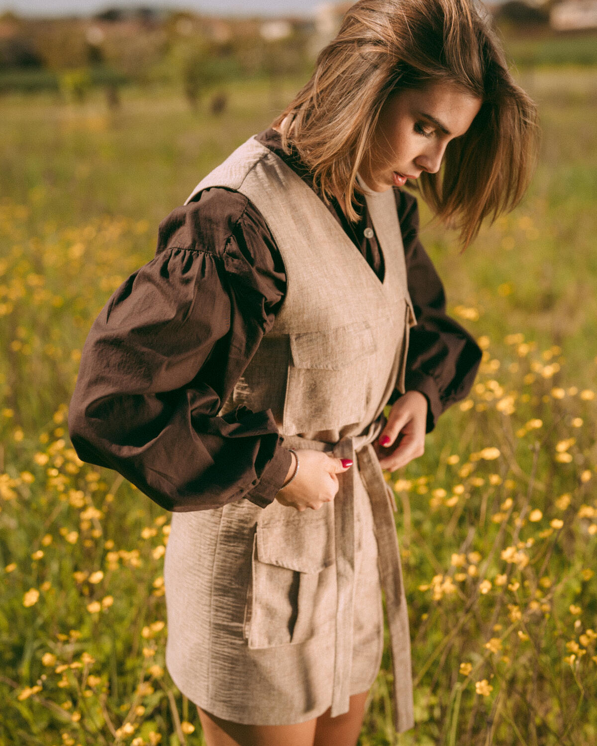 Mini dress smanicato in tessuto effetto lino, dal design essenziale e contemporaneo. Presenta scollo a V, tasche applicate sul davanti e cintura regolabile in vita che valorizza la silhouette. Leggero e versatile, è perfetto per un look casual-chic.