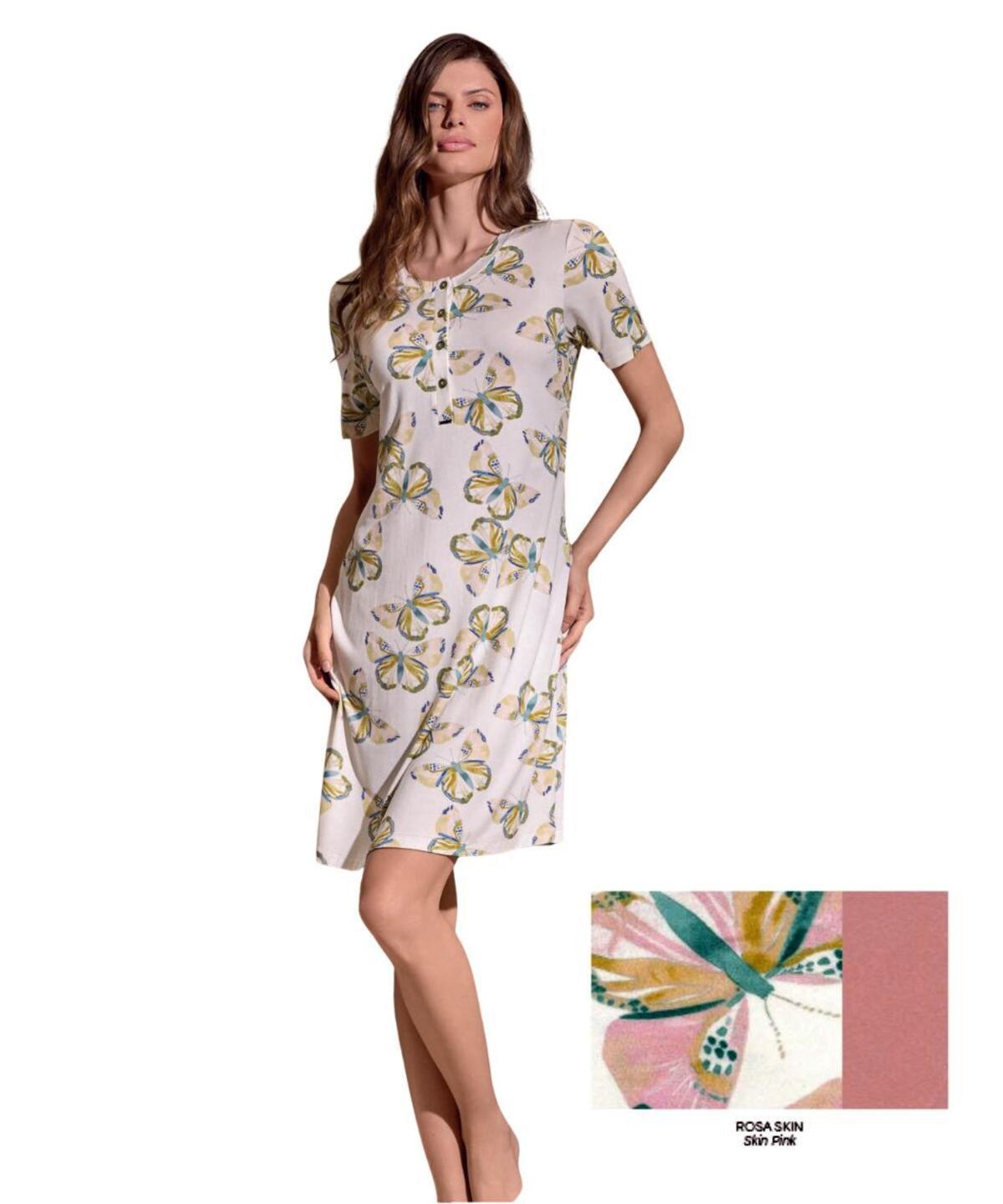 Camicia da notte donna a manica corta in jersey di viscosa elasticizzata con stampa farfalle, apertura a serafino.