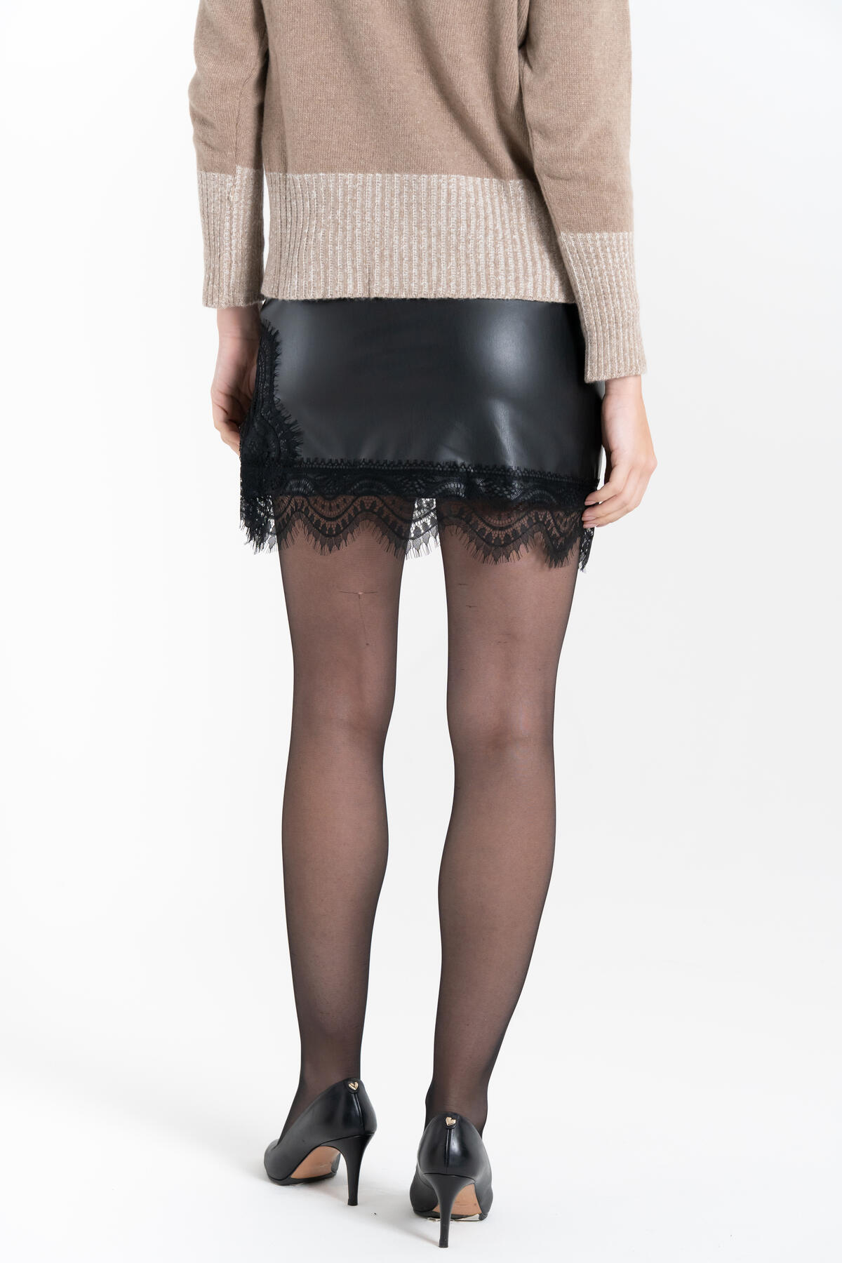 Minigonna elegante in ecopelle con bordo in pizzo, linea aderente che valorizza la silhouette.