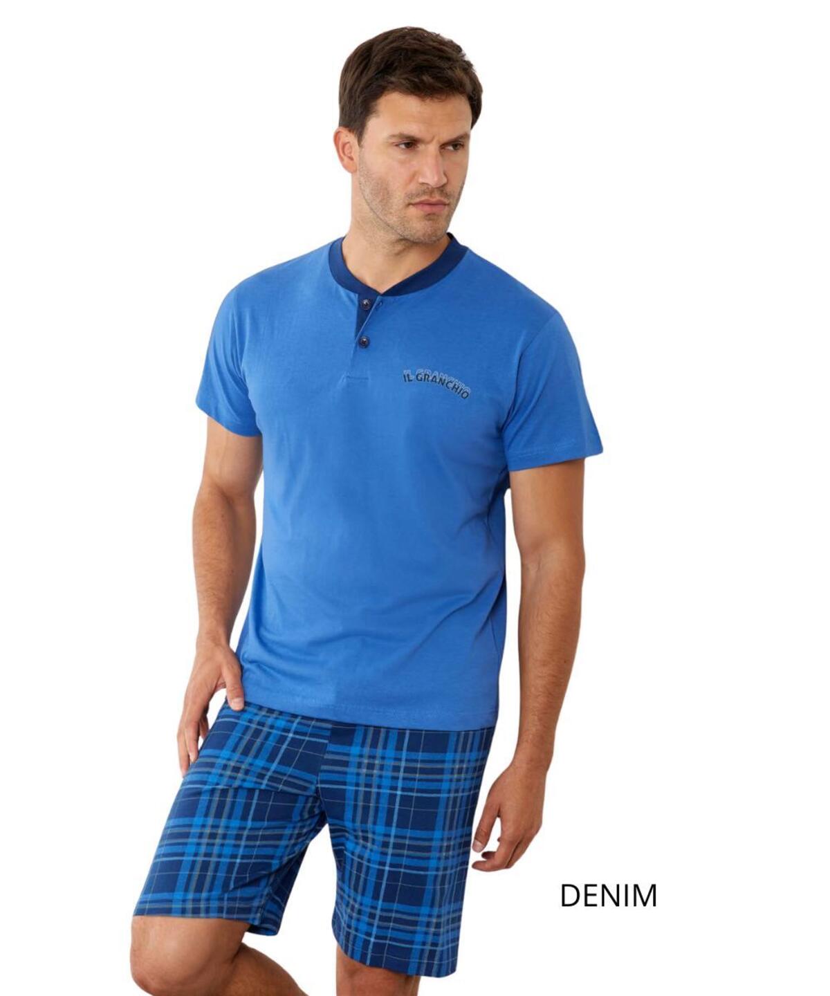 Pigiama uomo a serafino in jersey di cotone con logo e pantalone corto scozzese.