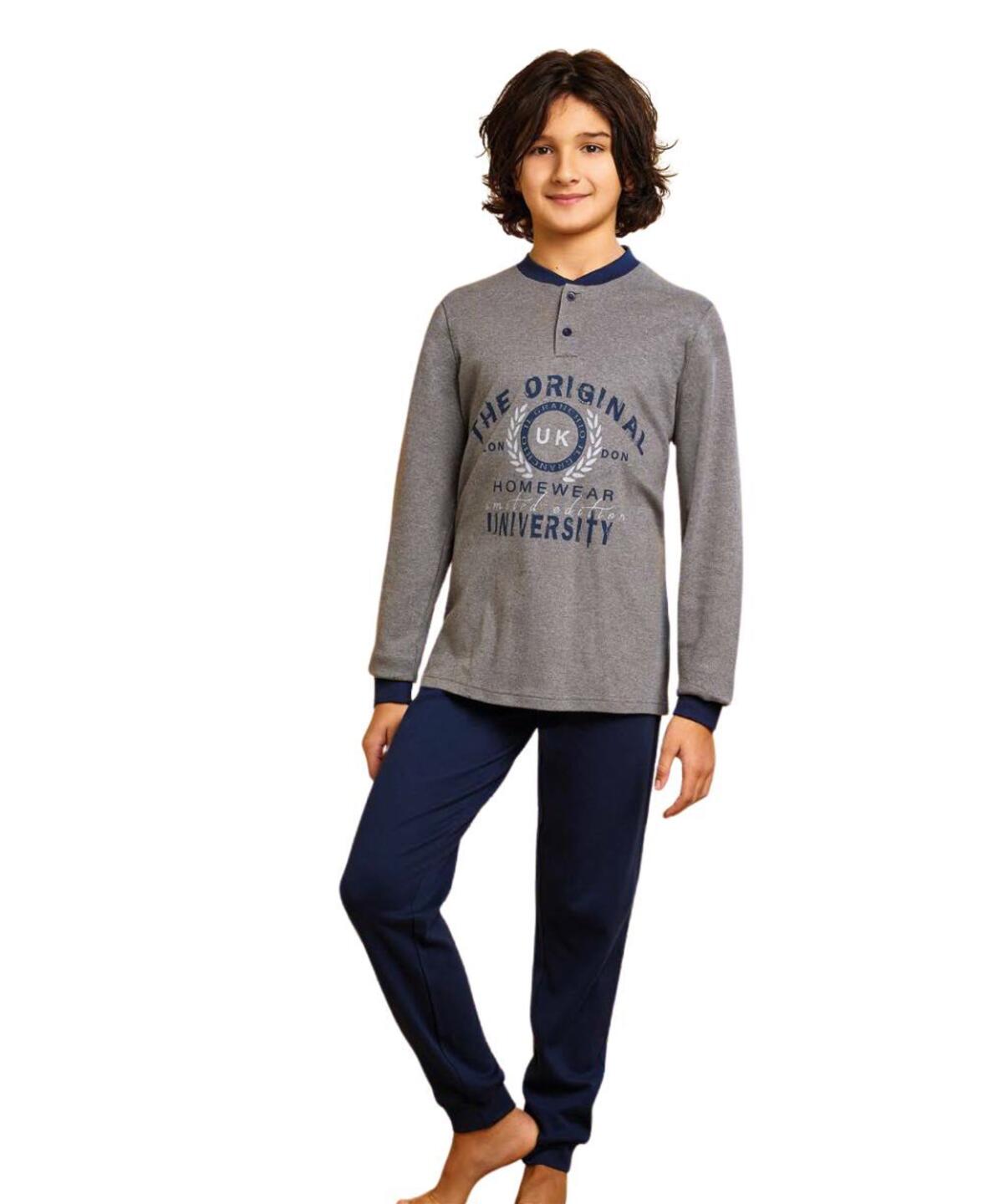 Pigiama da ragazzo in jersey di caldo cotone interlock (medio peso) con maglia a serafino due bottoni con stampa e pantalone tinta unita con polsini.