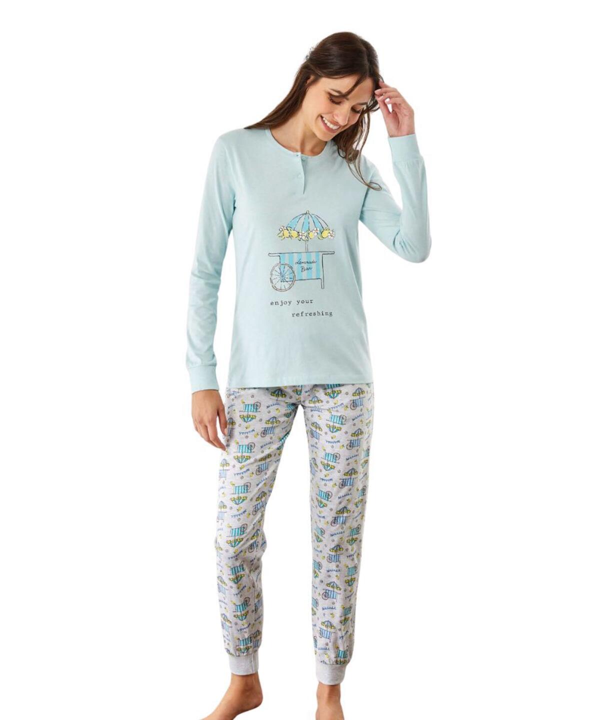 Pigiama donna a serafino in jersey di cotone con stampa e pantalone lungo fantasia con polsini.
