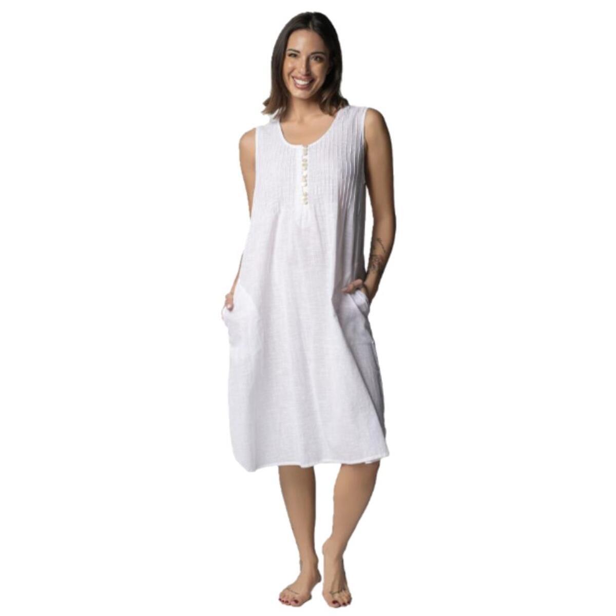 Abito midi smanicato in tessuto effetto lino. Un modello caratterizzato dalla pratica chiusura frontale con bottoni, perfetto per un look estivo sofisticato e fresco.