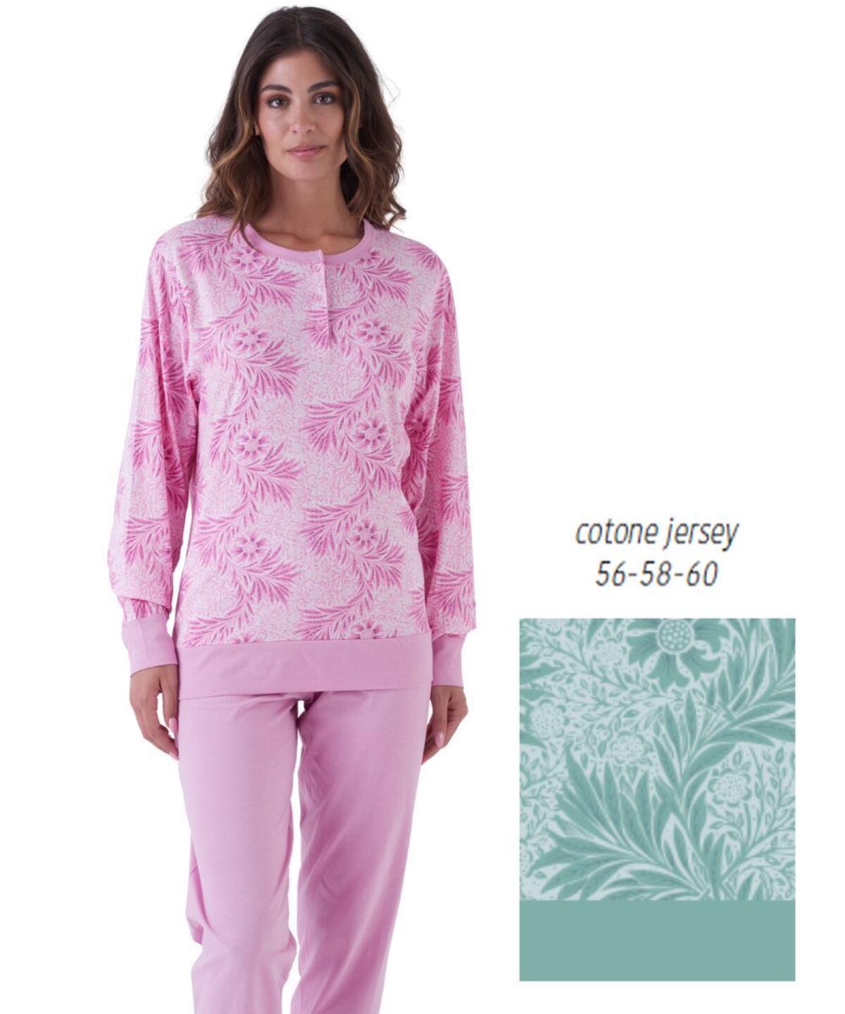 Pigiama donna TAGLIE FORTI a serafino in jersey di cotone fantasia e pantalone lungo con polsini.