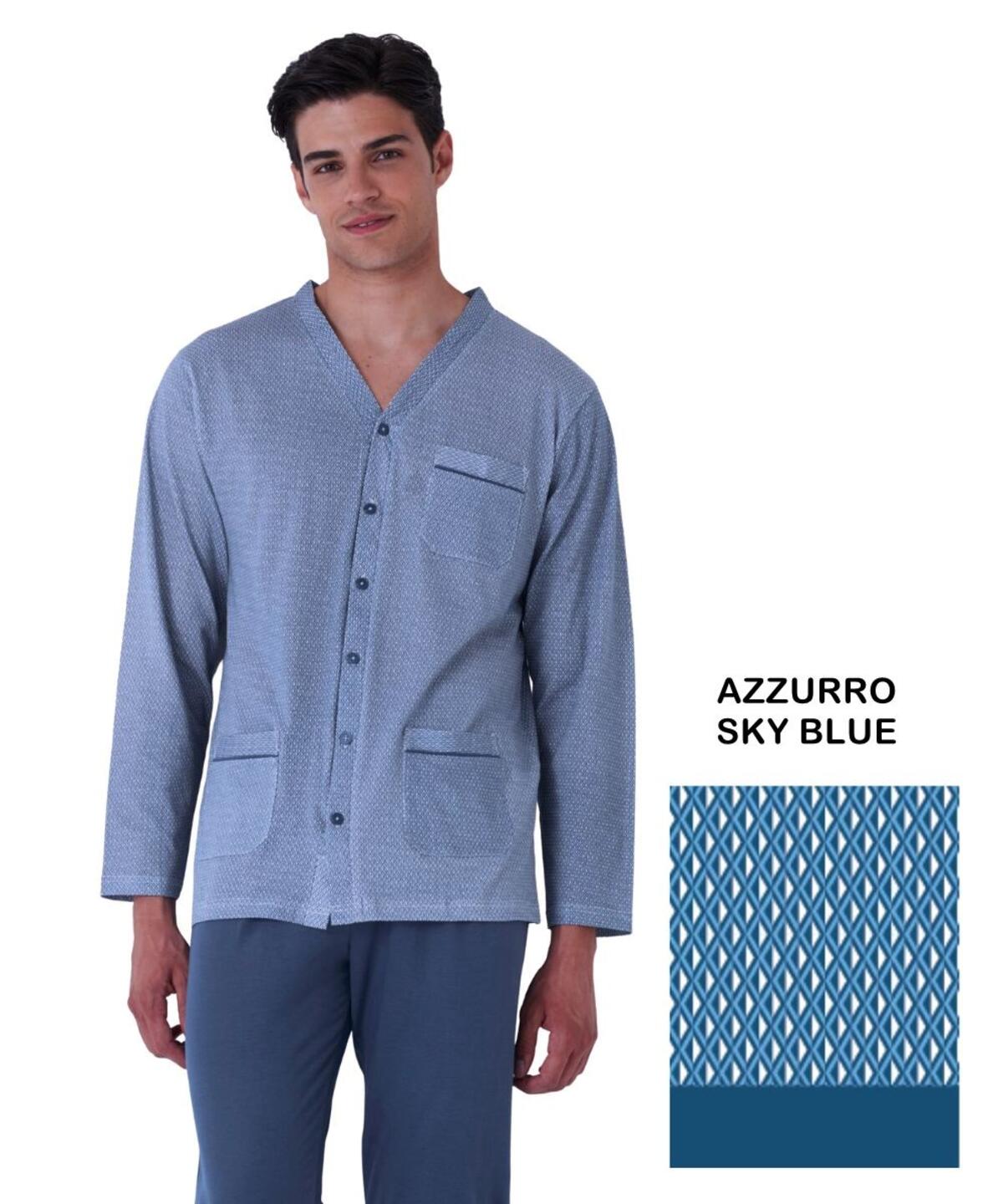 Pigiama uomo CALIBRATO con giacca aperta in jersey di cotone fantasia geometrica, tasche e pantalone lungo senza polsini.