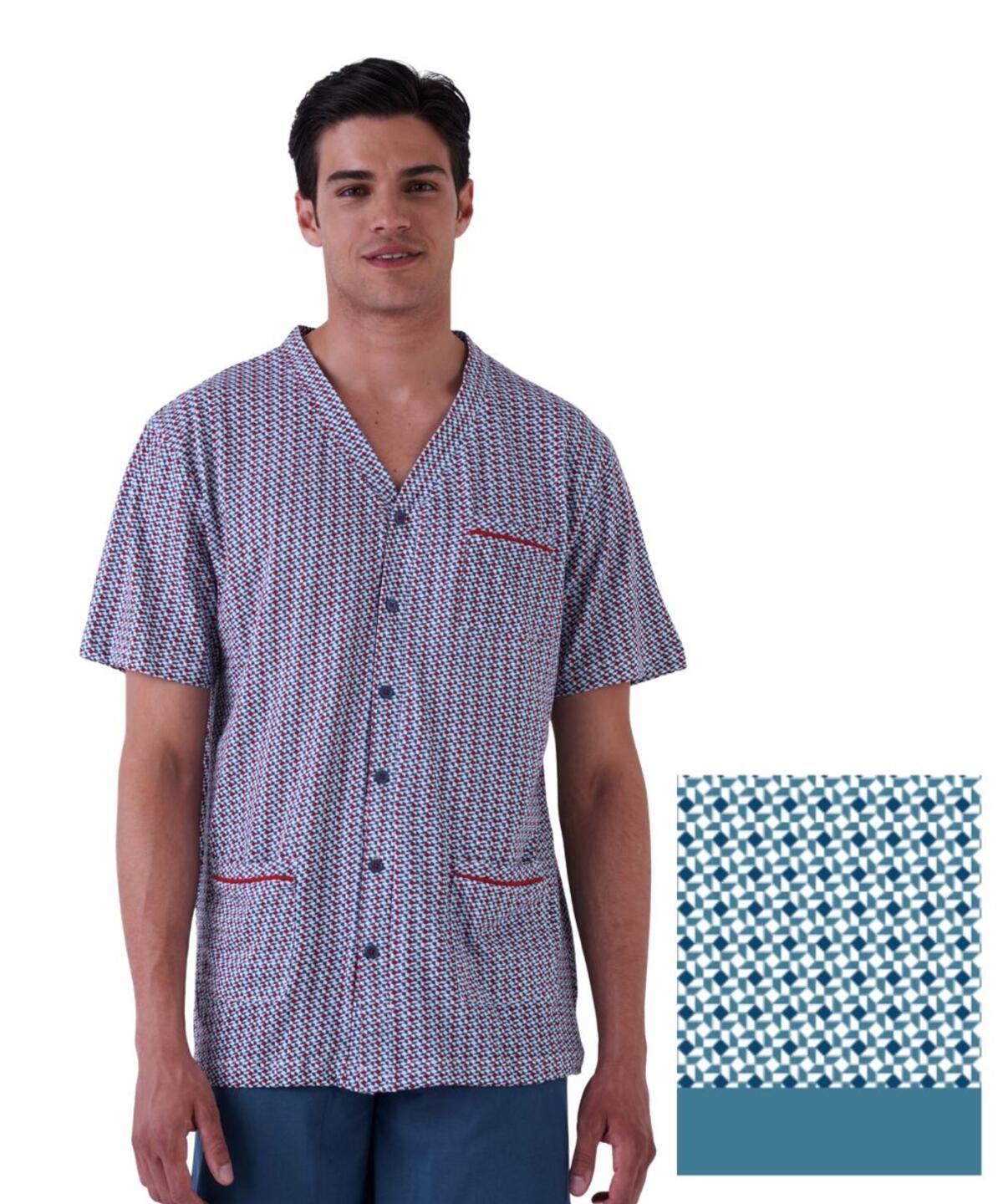 Pigiama uomo a maniche corte con giacca aperta in jersey di cotone fantasia geometrica, tasche e pantalone lungo senza polsini.