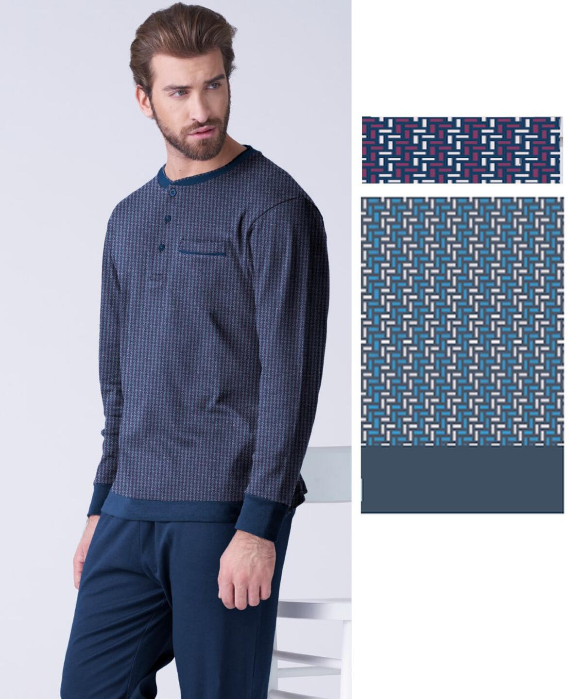 Pigiama uomo calibrato a serafino in jersey di cotone caldo (medio peso) fantasia geometrica con taschino e pantalone con polsini.