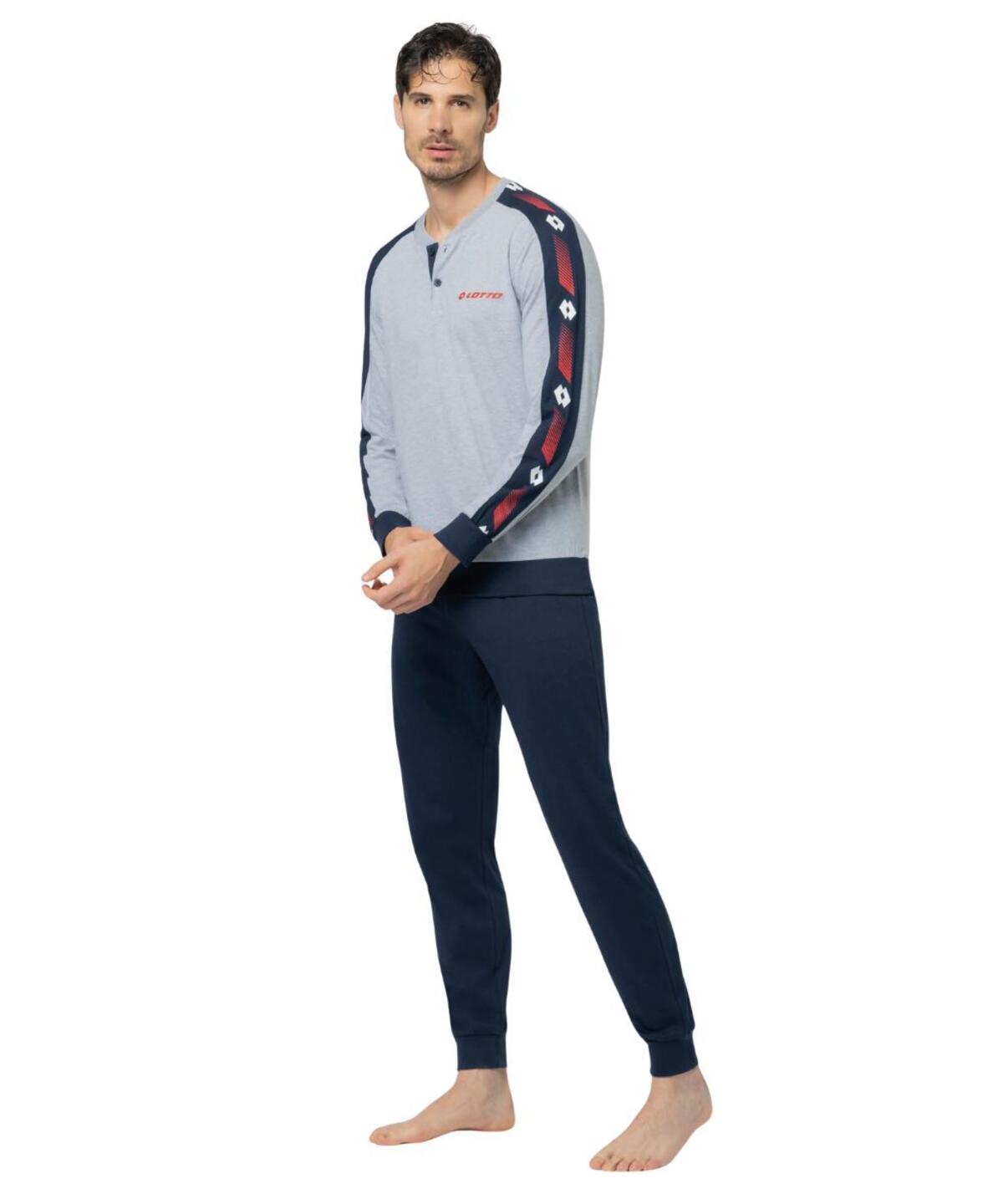 Pigiama uomo a serafino in jersey di cotone con stampa logo, bande colorate e pantalone con polsini.