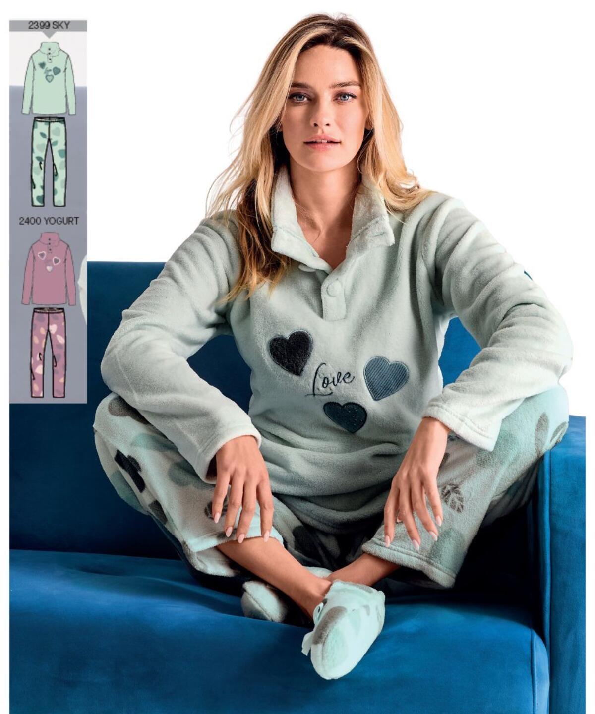 Pigiama a serafino con bottoni in CALDO e morbido PAIL CORAL con ricamo cuori e pantalone fantasia senza polsini.
