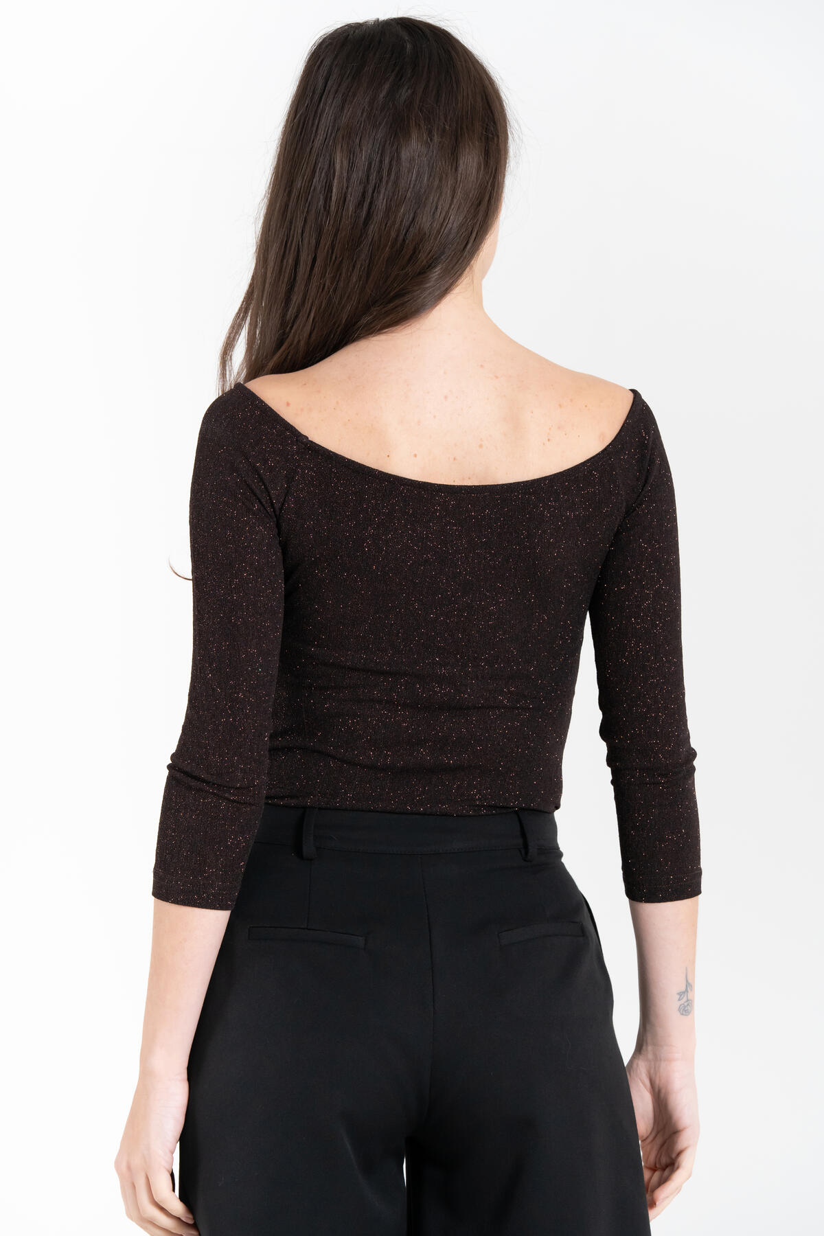 Body donna in tessuto lurex elasticizzato, con scollo a barca che valorizza le spalle. Maniche a 3/4 e vestibilità aderente per un look elegante e versatile.