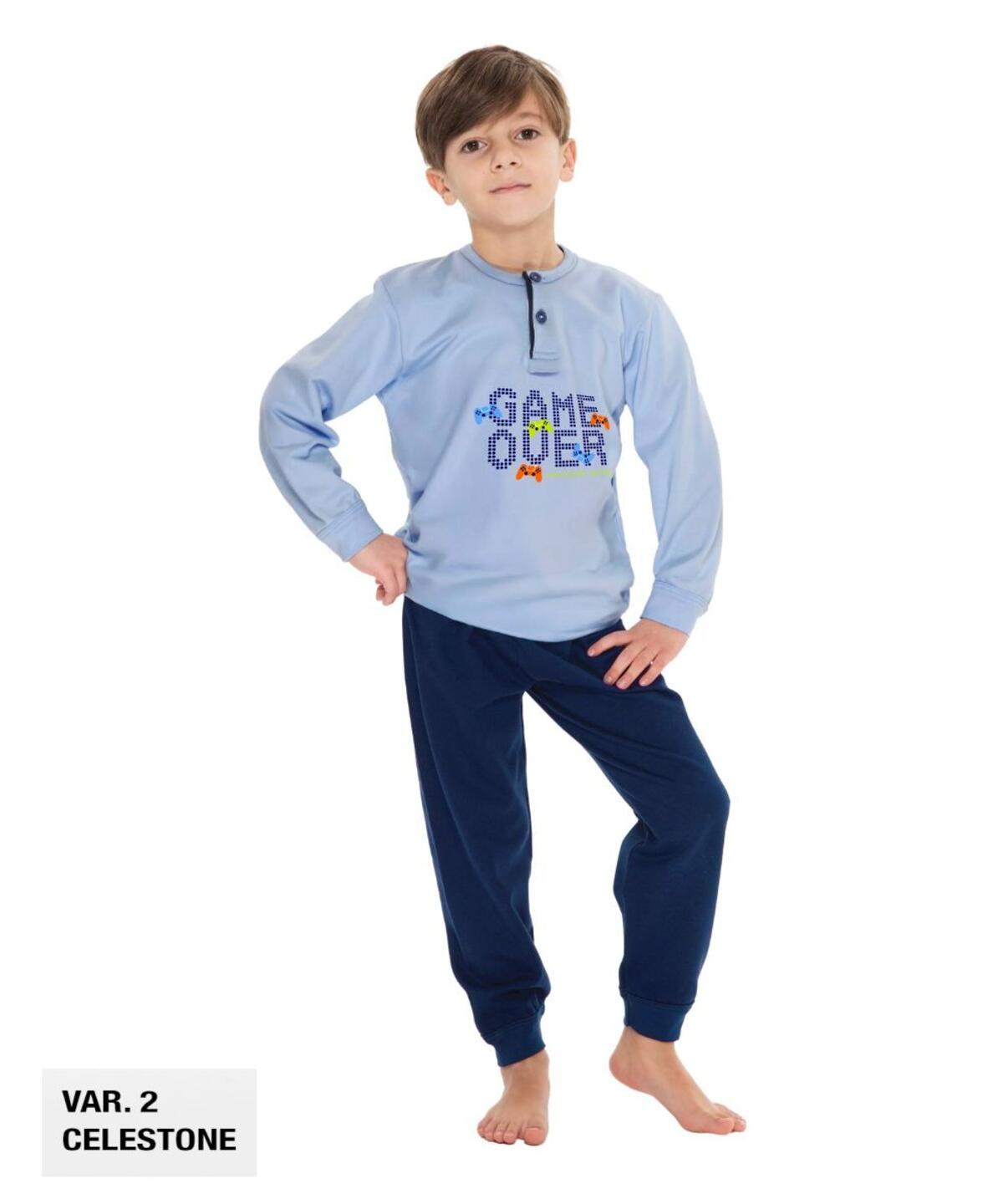Pigiama da bambino a serafino in jersey di CALDO cotone (medio peso) con stampa e pantalone lungo con polsini.