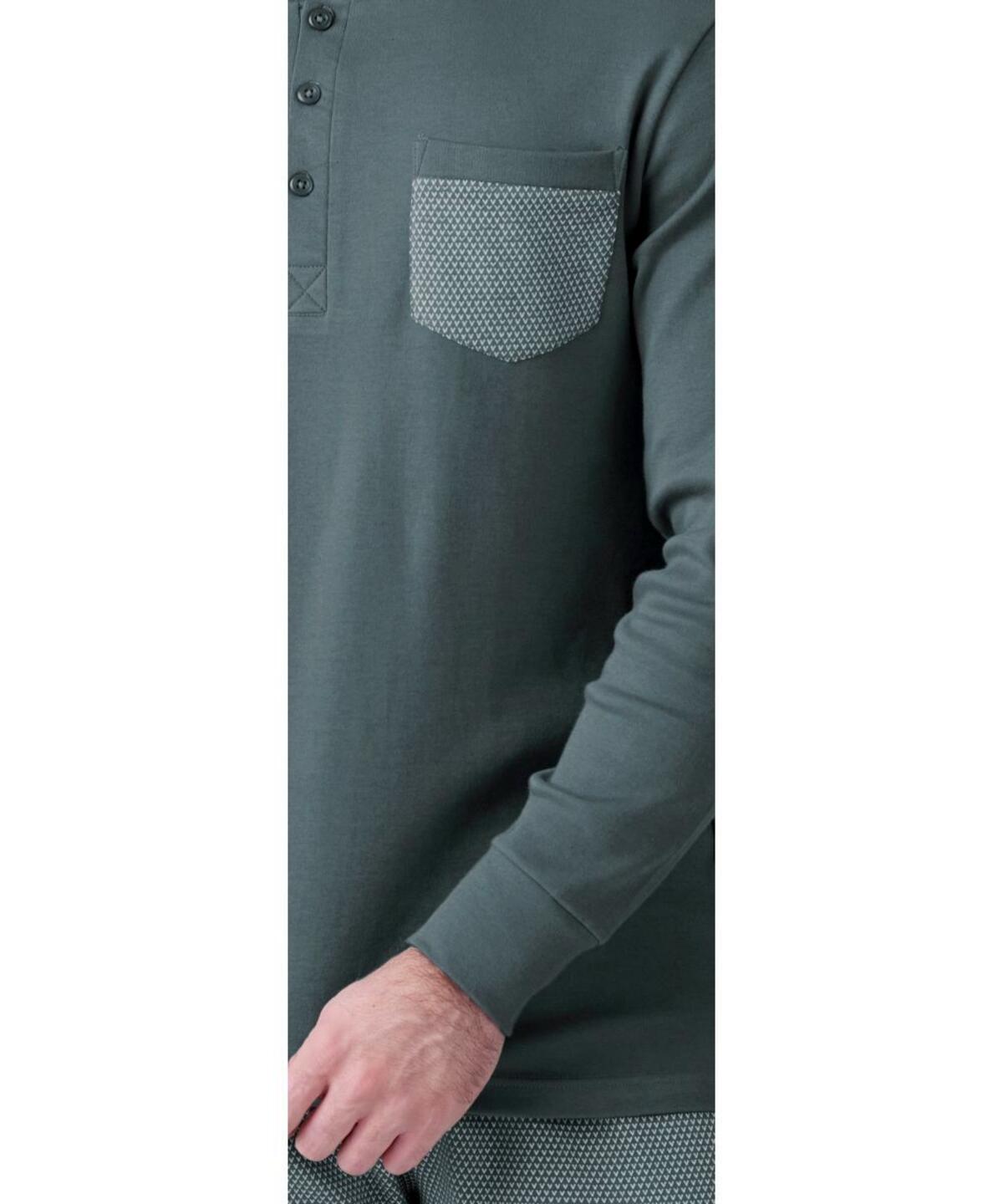 Pigiama uomo a serafino in CALDO cotone felpato tinta unita con taschino e pantalone in micro fantasia con polsini.