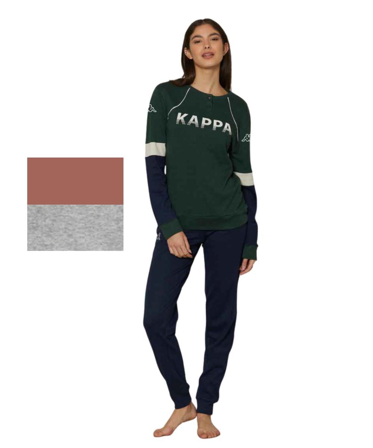 Pigiama donna a serafino in jersey di cotone caldo (medio peso) con stampa logo, bande colorate e pantalone con polsini.