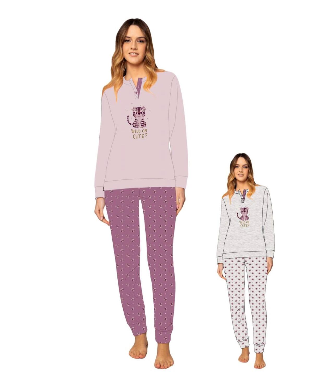 Pigiama donna a serafino in jersey di cotone caldo (medio peso) con stampa tigrotto e pantalone fantasia con polsini.