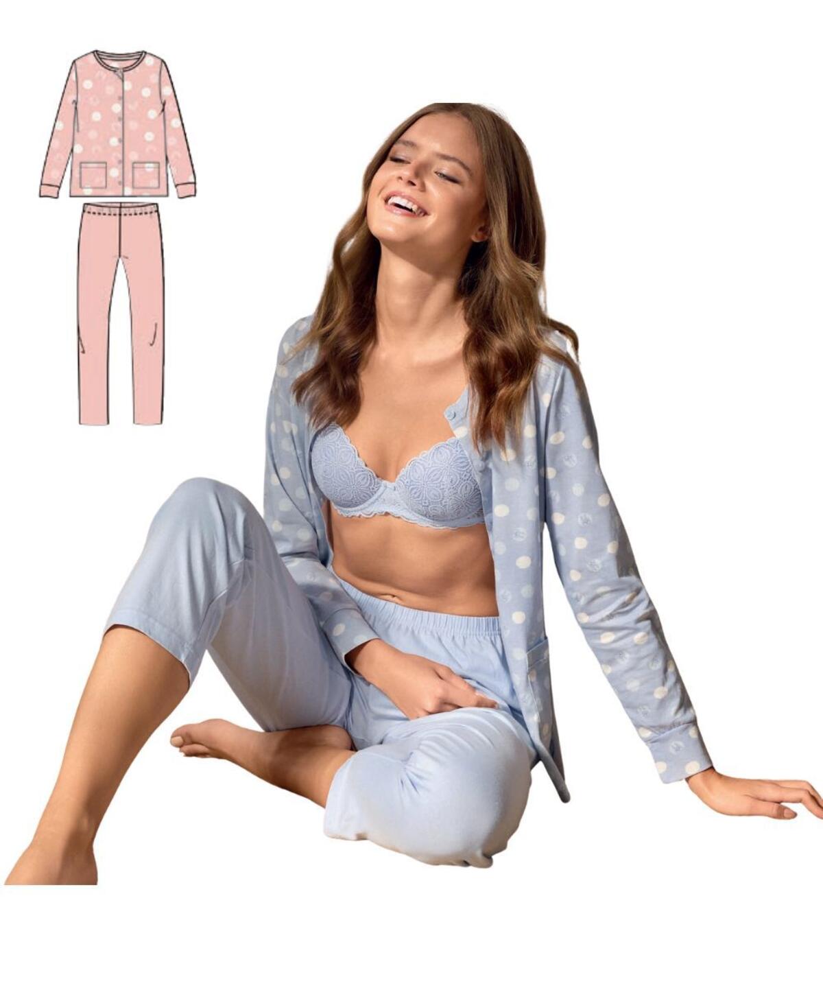 Pigiama donna APERTO a manica lunga in jersey di cotone con motivo a pois e pantalone fantasia con polsini.