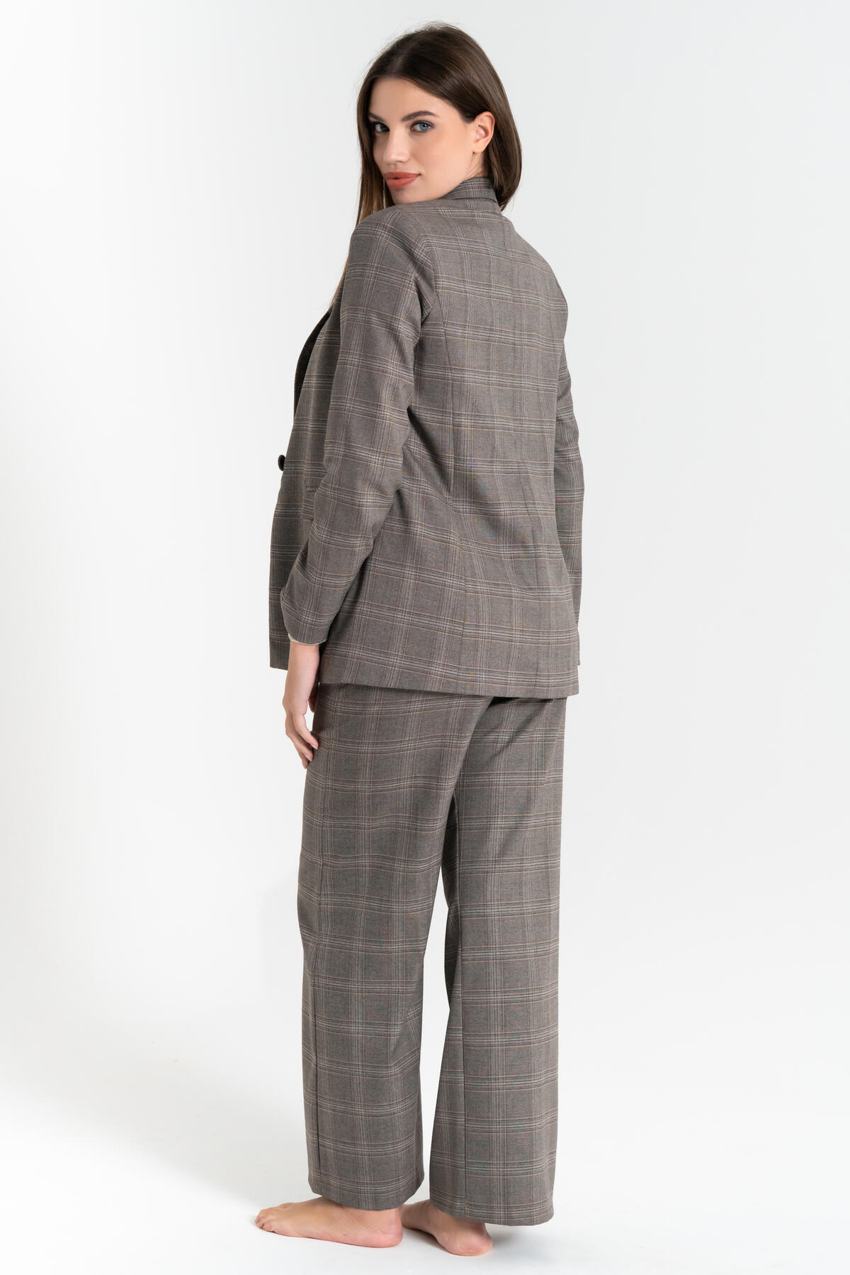 Pantalone da donna in fantasia scozzese, tasche aperte di lato, chiusura bottone.