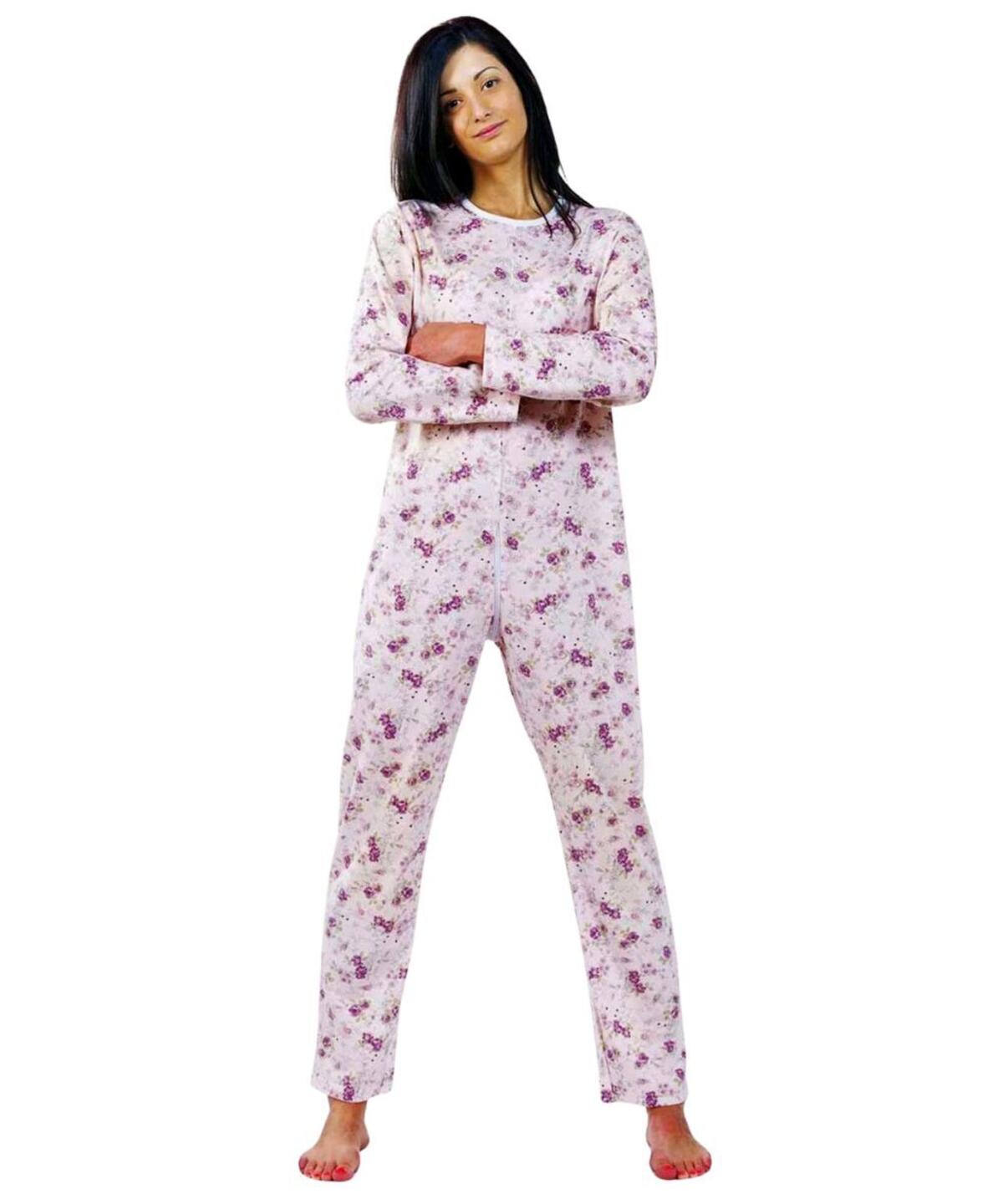 Pratico tutone pigiamone FEMMINILE in jersey di cotone PRIMAVERILE per anziani e per case di riposo manica lunga, con cerniera posteriore lunga che prosegue fino a livello ventre per poter intervenire senza dover togliere l'indumento, comodo e facile da indossare. Senza polsini.