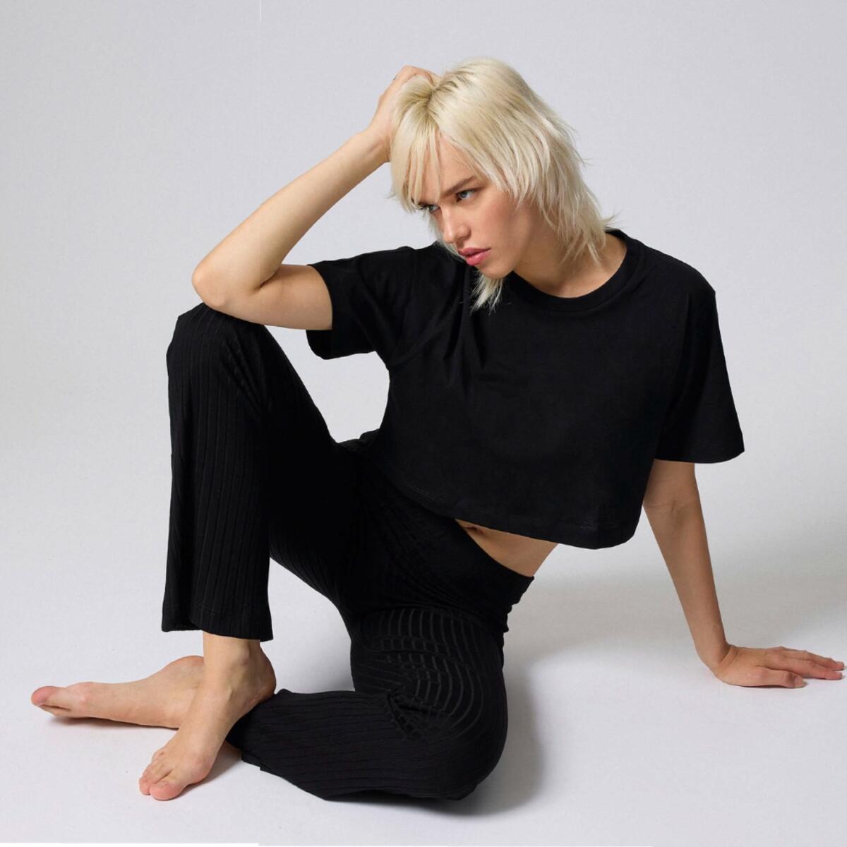 Pantalone con gamba a palazzo in viscosa elasticizzata a coste.