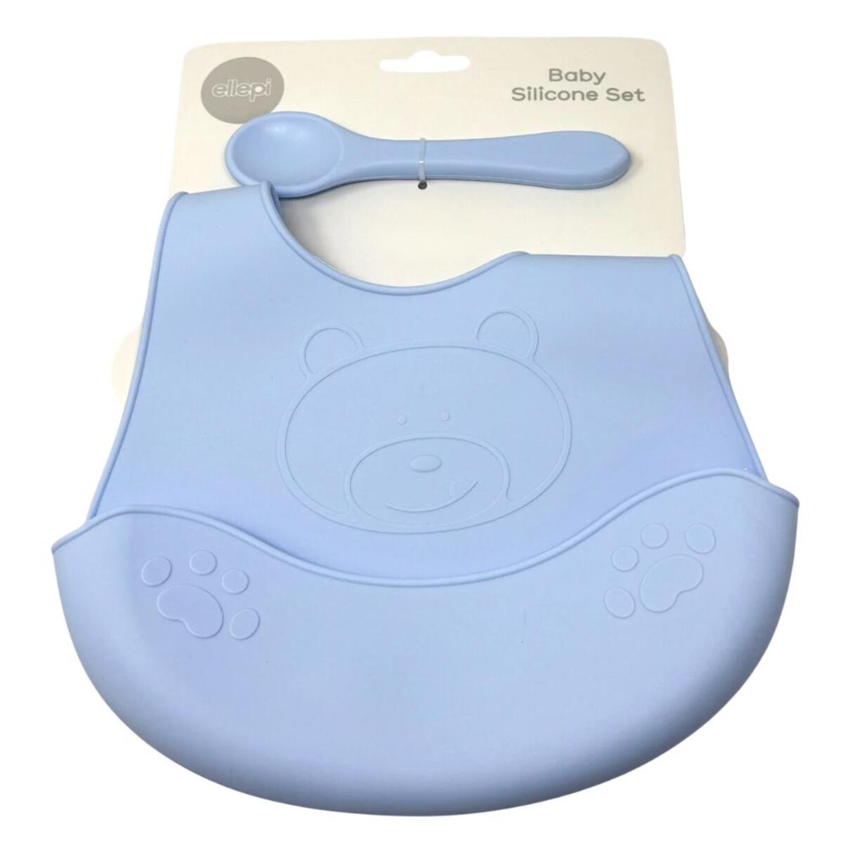 Силиконовый набор для детского питания, состоящий из слюнявчика и ложки.