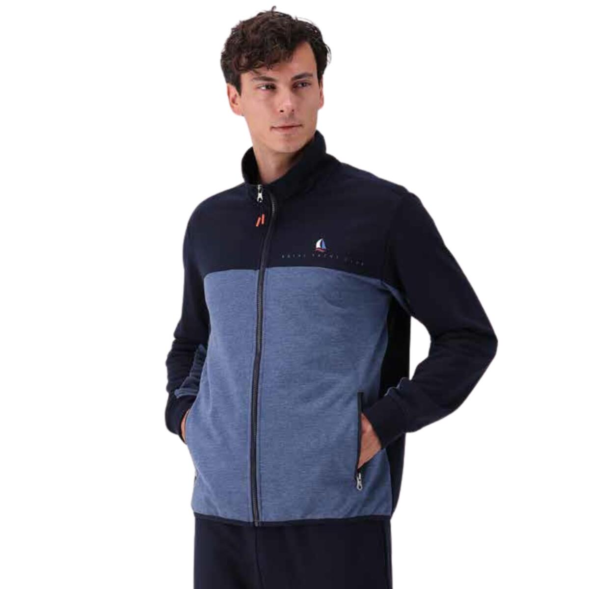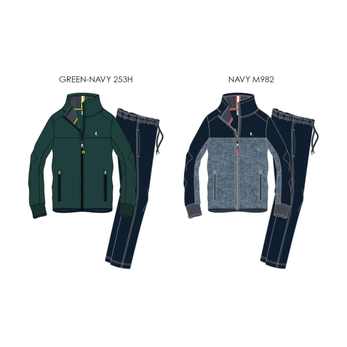 Мужской длинный костюм-двойка из ворсистого флиса, состоящий из расстегнутого пиджака с застежкой-молнией по всей длине, воротником и боковыми карманами, а также прямых брюк с карманами и эластичным поясом на шнурке.